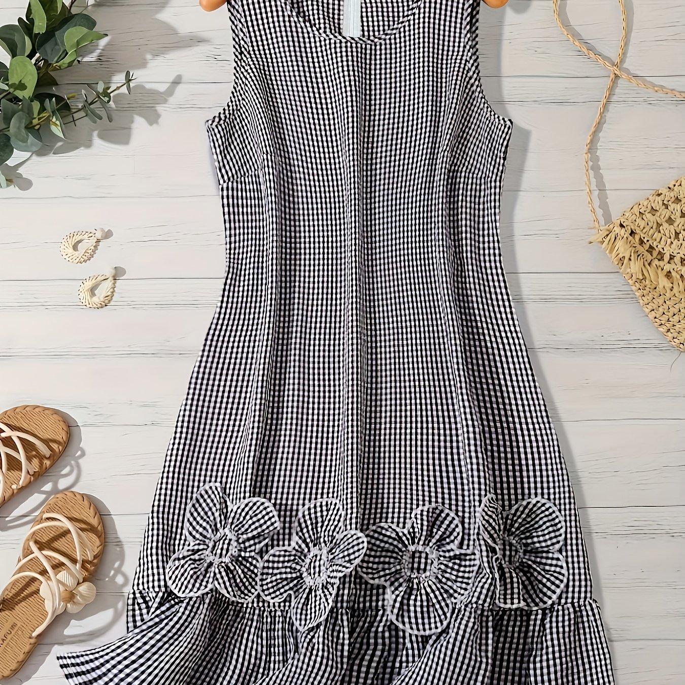 TEMU 여성용 블랙 앤 화이트 체크 3D 플로럴 드레스, 여름 캐주얼 휴가 스타일, 러플 스윙 A라인 드레스, 세탁기 사용 가능