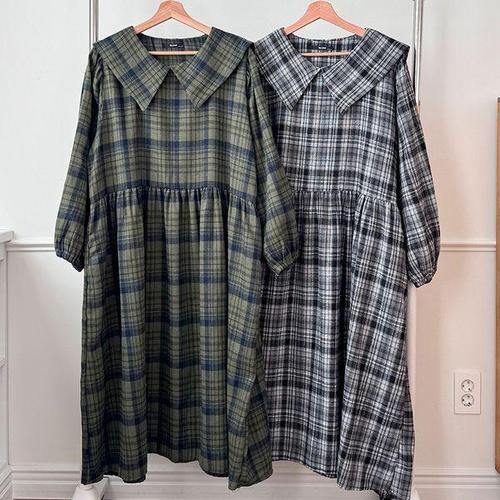 [다잇템][다잇템] 여자 세일러카라 박스 격자 귀여운 임산부 벌룬 롱원피스_23387265_588872