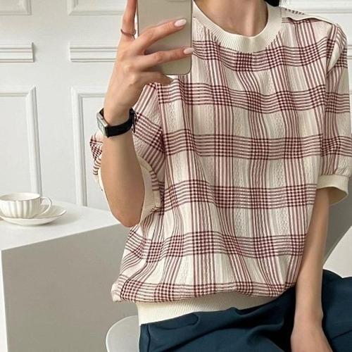 [옷자락]여성 콘트라스트 격자 자가드 박시 면원단 U넥 블라우스