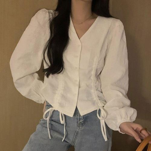 [XBJ94L5L]밑단 스트링 블라우스 자카드 원단 브이넥