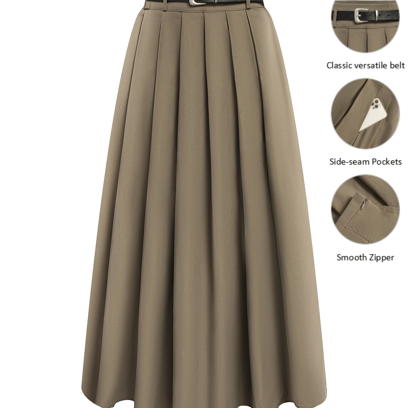 TEMU DP070401 + 링샨 디렉셔널 + 여성용 우아한 가을 A라인 스커트 힙 커버링 하이웨이스트 스커트 플리츠 롱 스커트 (벨트 포함)