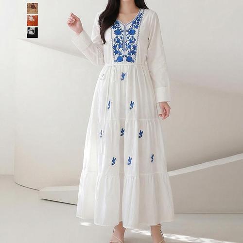 [비꼴리끄]린넨 밴드 넥 꽃자수 원피스 B252WO2050