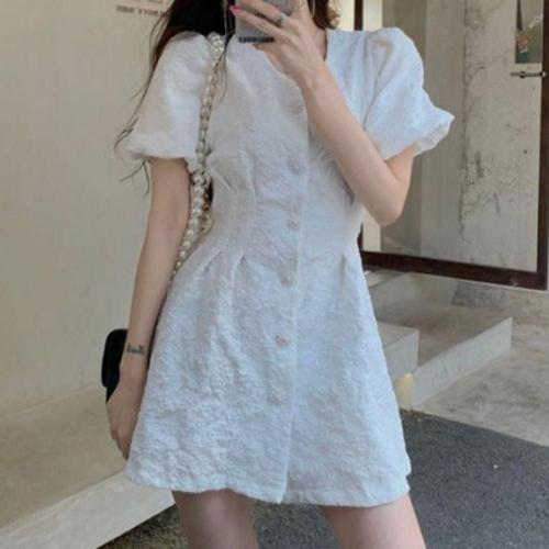 손오천 여사친 원피스 여름 퍼프 브이넥 쉬폰 셔링 자수 슬림핏 소매 데일리룩 A라인 KUK1