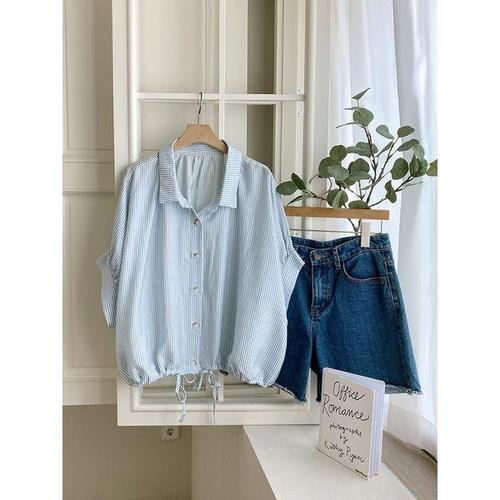 [샵앤]여성 카라넥 잔스트라이프 반팔 블라우스 BONG-WBL-4510-블루