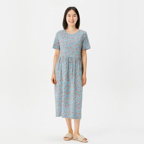 [옷자락] 여자 나염 아사면 코튼 루즈핏 반팔 잠옷 원피스