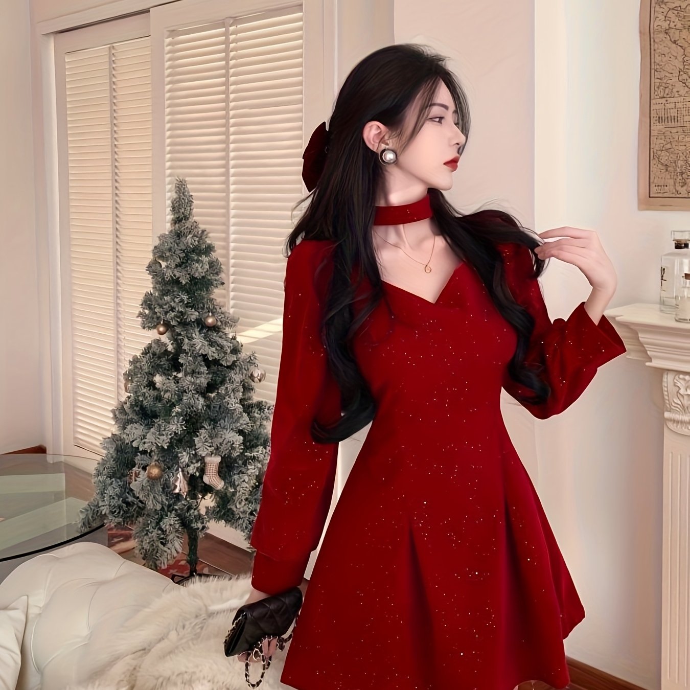 TEMU 여성용 우아한 블랙 벨벳 첫사랑 드레스 - 스퀘어넥 긴팔 A라인 파티 & 포멀 이브닝 가운, 손세탁 가능, 올 시즌 럭셔리 포멀 복장 (크리스마스, 새해, 발렌타인데이) - QOQ 럭셔리 드레스 컬렉션, 귀여운 드레스