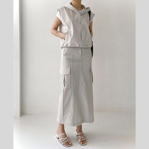 [바이어스]후드 집업 조끼 카고 핀턱 H라인 롱 스커트 세트 코디 (16458299A)