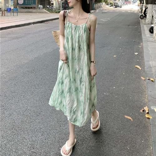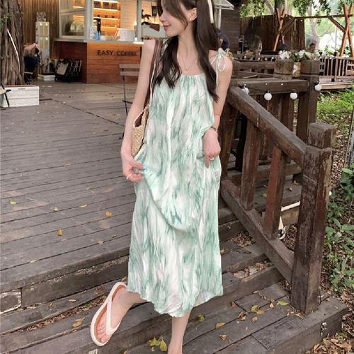 하늘하늘 끈나시 주름 나염 여성 여름 롱 원피스 WFIXA8G