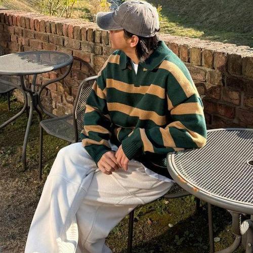 [다잇템_패션]커플 박시핏 FW 줄무늬 오픈넥 니트티