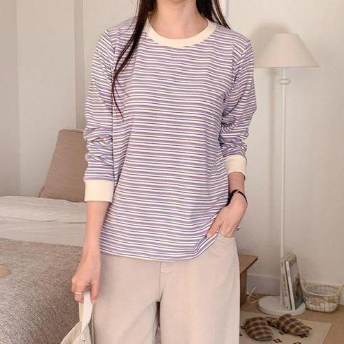단가라 3색 줄무늬티 편한 긴팔 티셔츠 여자 캐주얼 루즈핏 (WFKBXF8)