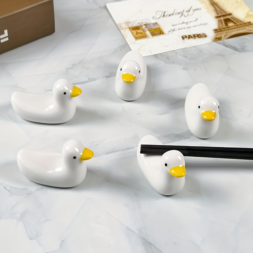 TEMU 귀여운 오리 세라믹 젓가락 & 식기 받침 5개 세트 - 노란 부리가 있는 흰 오리, 젓가락, 숟가락, 포크 받침 - 식사용 귀여운 식기 / 생선 요리용 - 세라믹 오리 테마 테이블 선물