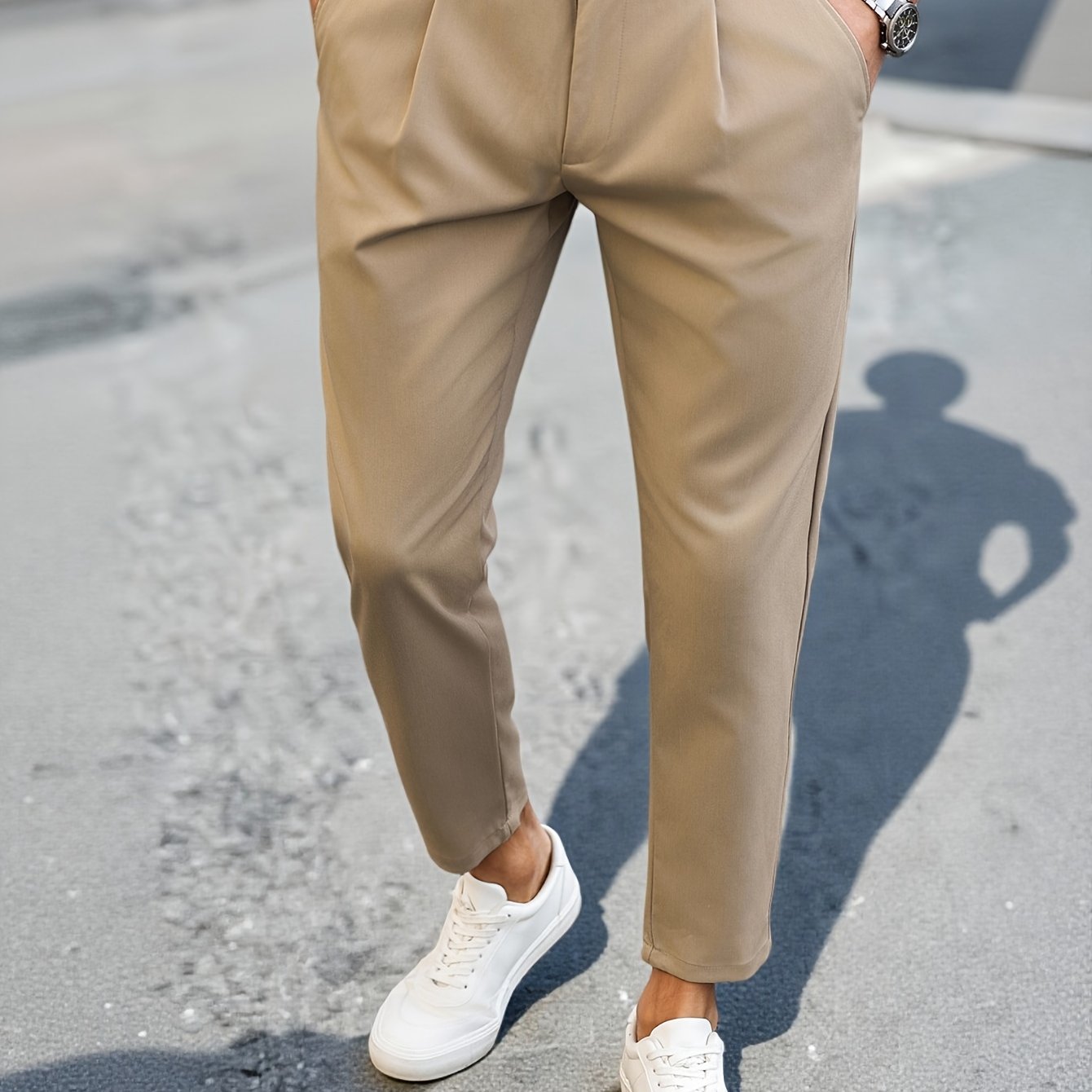 TEMU 남성 슬림핏 스트레치 롱 팬츠 - 라이트 브라운, 편안하고 스타일리시함, 비즈니스 캐주얼에 적합, 세탁기 사용 가능, 주름 방지 원단, 클래식 디자인, 플리츠 디테일