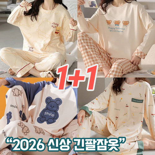 [캡내장+브라포함]1+1 라운드넥 여성 긴팔잠옷세트 (2세트)