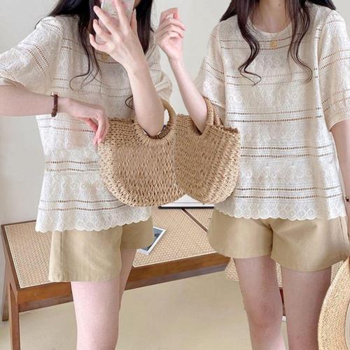 [의류] 휴가 셔링 레이스 펀칭 반팔 블라우스 물놀이