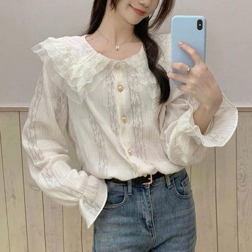 [옷자락]여자 진주 SS 여성스러운 레이스 프릴 카라 블라우스