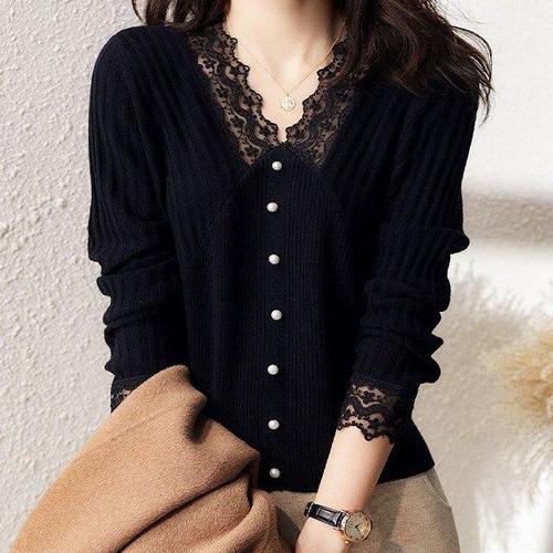 ROYALBELLE 여성 라운드넥 레이스 포인트 진주 버튼 긴팔 티셔츠 우아한 디테일과 편안한 티셔츠 A0070719