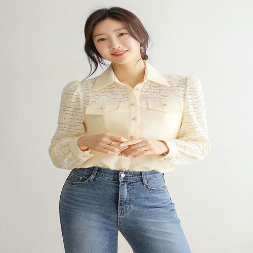 [스타일온미][루이스엔젤] 구름 플라워 레이스 배색 진주 버튼 블라우스