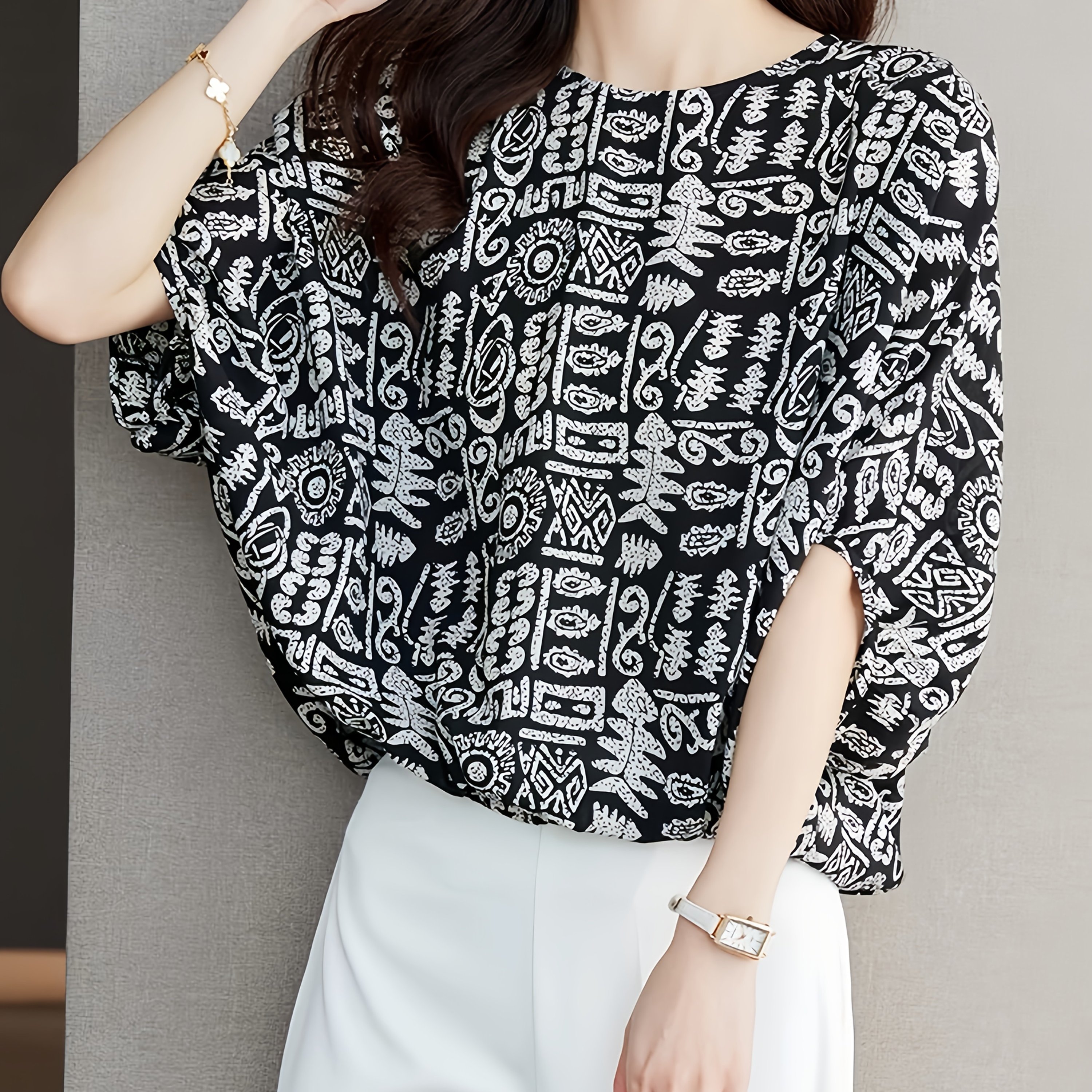 TEMU 여성용 프린트 루즈핏 반팔 티셔츠 - 우아한 라운드넥, 중간 신축성, 세탁기 사용 가능, 봄 여름 가을 캐주얼 탑, 시즌 패션, 비투명 소재