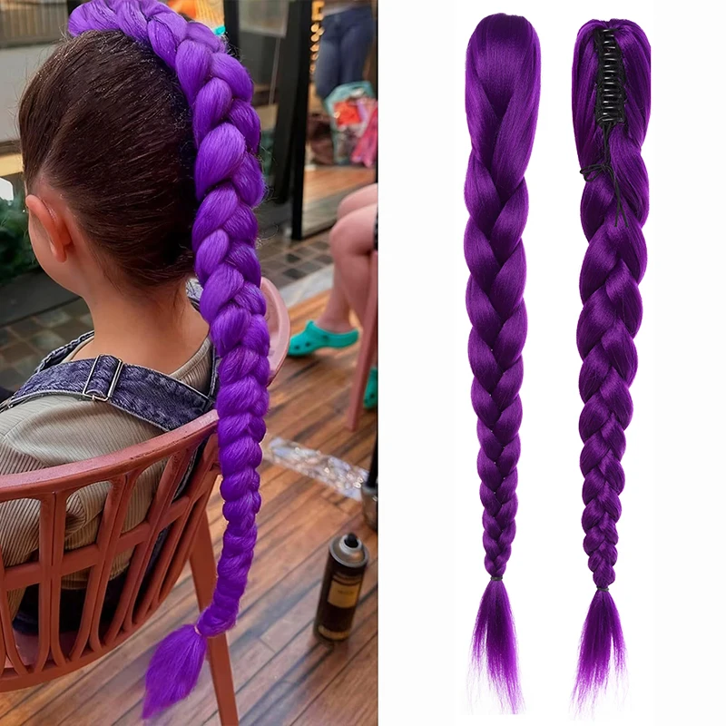 28인치 합성 머리 긴 땋은 보라색 머리 포니테일 익스텐션 루미 헤어스타일 클로 클립 헤어 가발 어린이용 크리스마스 파티용