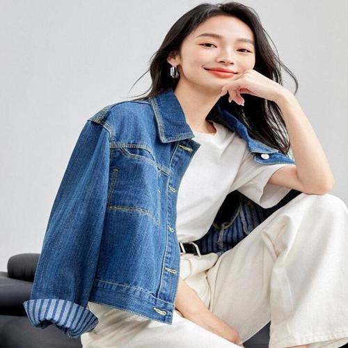 [어바웃탑][어바웃탑] 배색 스트라이프 소매 아치형 밑단 세미 오버핏 크롭 청자켓