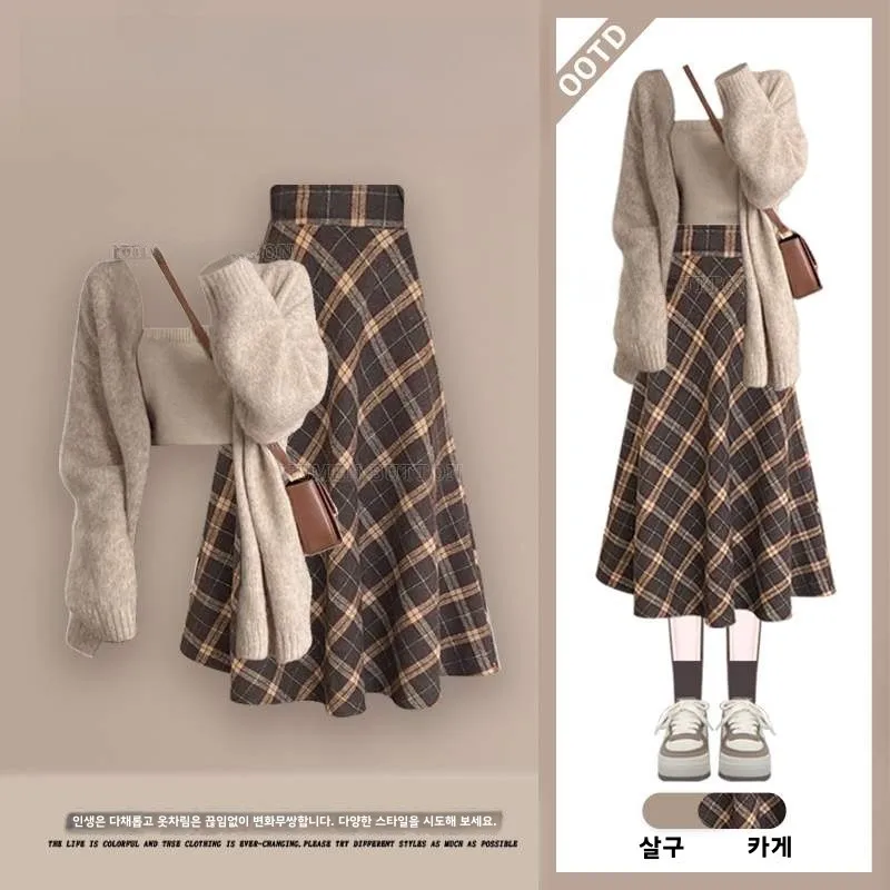 플러스 사이즈 여성용 봄 하이웨이스트 A라인 스커트 니트 가디건 캐미솔 체크무늬 3피스 세트 슬림핏 패션 세트