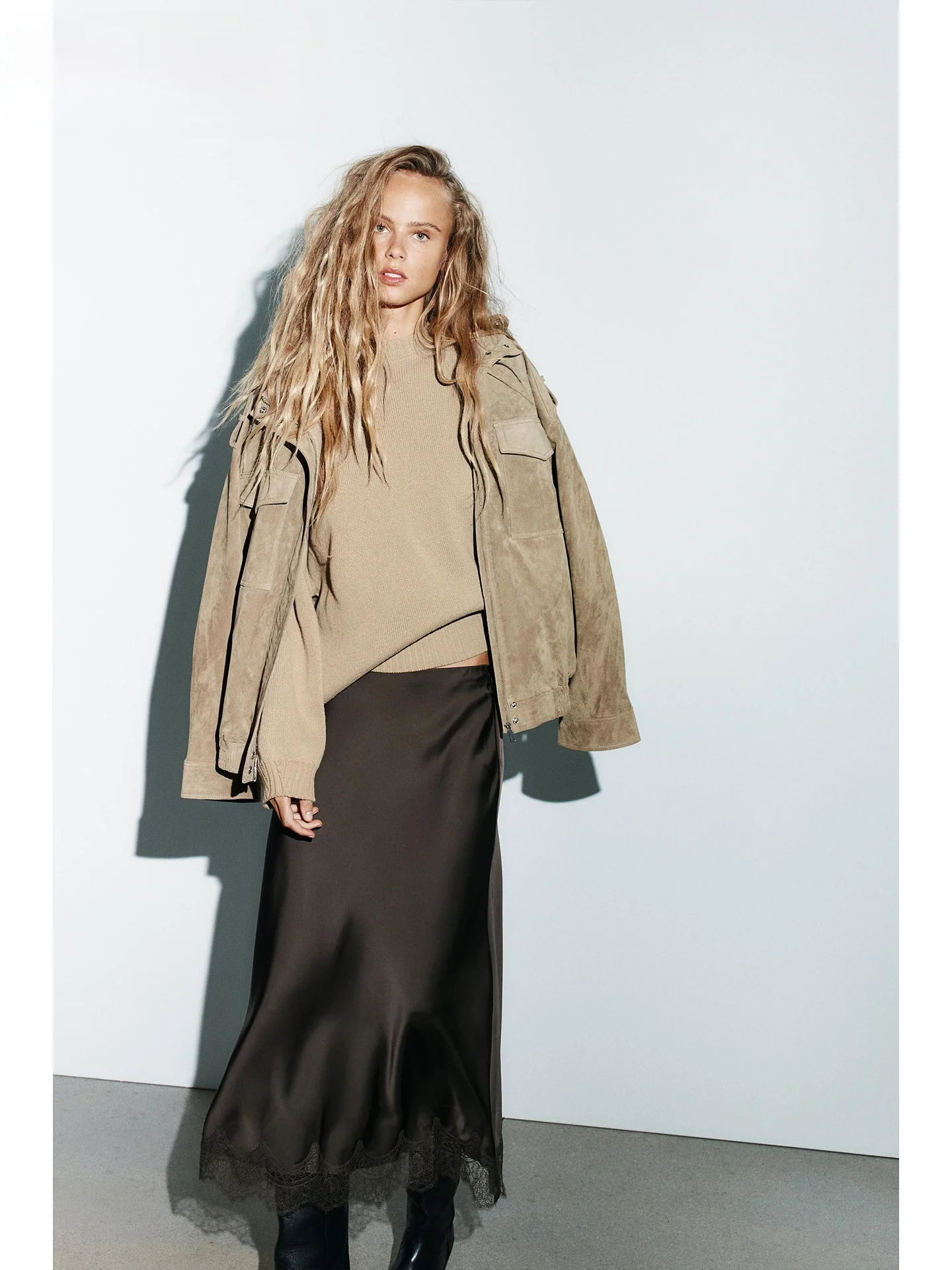 ZAPRHA 2025 가을 신상 레이스 트림 실크 새틴 텍스처 미디 홀터 스커트 슬림 하이웨이스트 캐주얼 스트레이트 컷 여성 스커트
