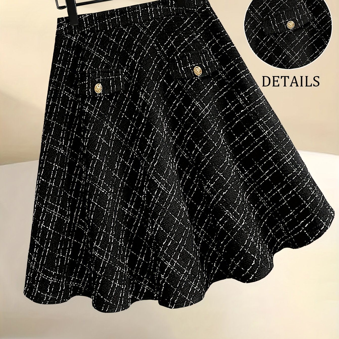 TEMU 플러스 사이즈, 플러스 사이즈 하운드투스 체크 A라인 스커트 - 우아한 스코티시 타탄 미디 길이, 플레어 우산 밑단, 와이드 스윙 스커트, 오피스 & 세미 포멀 웨어, 세탁기 사용 가능 (블랙/화이트/그레이)