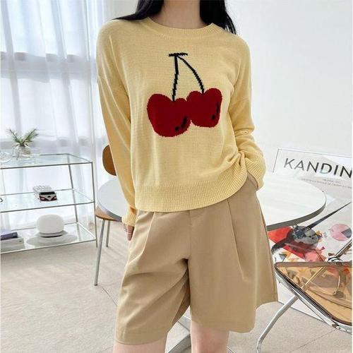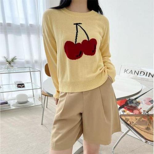 가벼운 라운드 여성 긴팔 체리 니트티 코디룩 20대