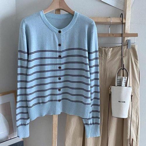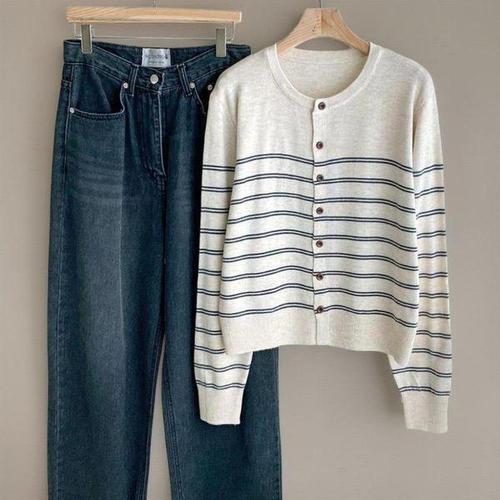 [신상오픈런]여성 클래식 더블 스트라이프 울 라운드넥 긴팔 니트 가디건