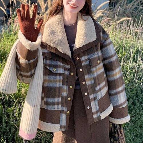 봄 가을 중년 여성 숏 모직 코트 여성용 가을 두툼한 슬림핏 체크 울 코트 고급스러운 패션 외투 JXH