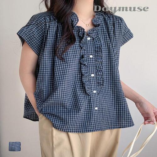 [모어오브]레디 반팔 셔츠 프릴 체크 탑