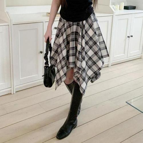 [셀러허브_여성트랜드패션]여자 간절기 언발 체크 밴딩 플레어 스커트
