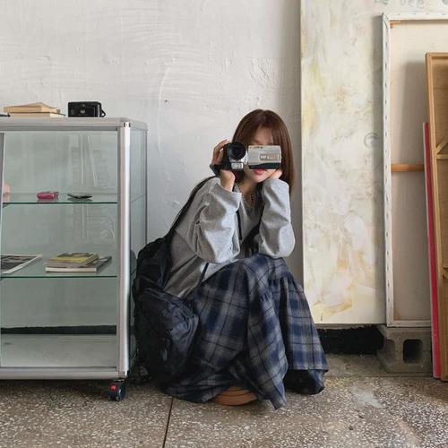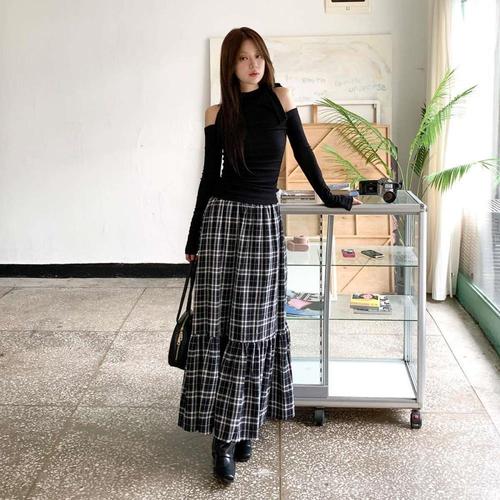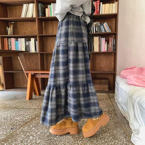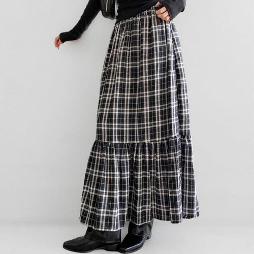 [옷자락]여성 캐주얼 배색 체크 캉캉 밴딩 롱 스커트