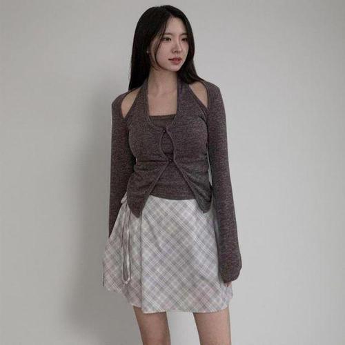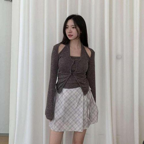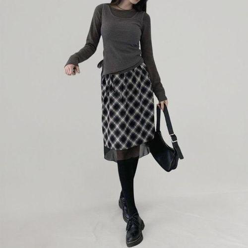 델루비오 체크 셔츠 힙커버 레이어드 미니스커트