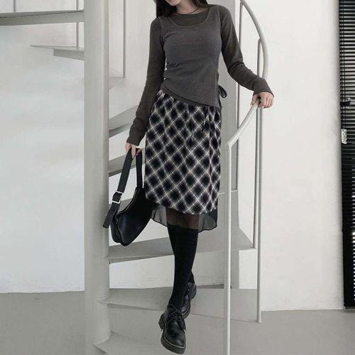 [신상오픈런]여성 체크 패턴 쉬폰 레이어드 미니 스커트