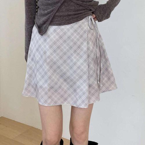 [옷자락]여자 캐주얼 사선 체크 스트랩 플레어 미니 스커트
