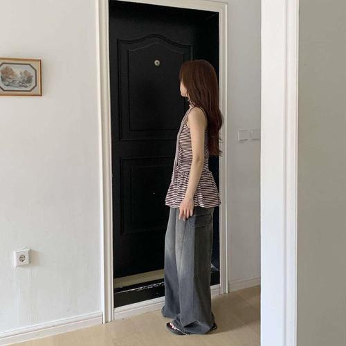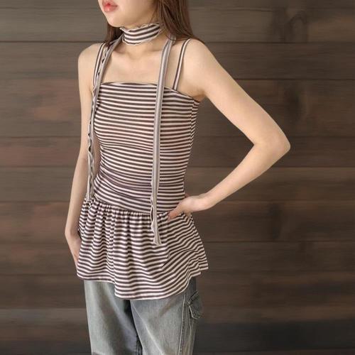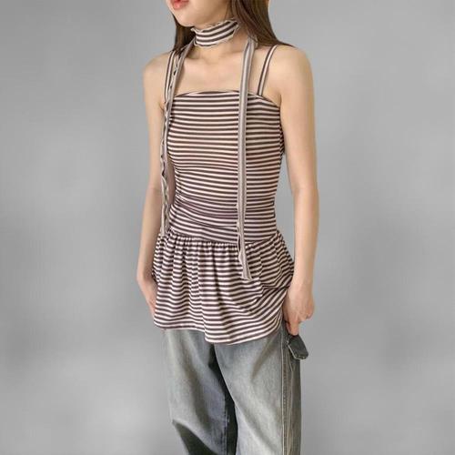 |KHO560C|여성 스트라이프 프릴 초커 슬림핏 민소매 미니 드레스