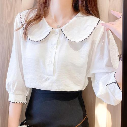 [셀러허브_여성트랜드패션]ONM 물결 빅카라 7부 블라우스 쉬폰군살커버 데이트룩