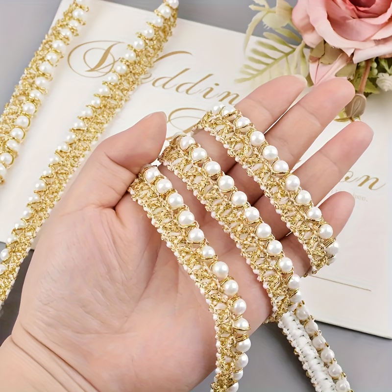 TEMU 9.14미터 우아한 금색 진주 레이스 트림 - 세밀한 진주가 들어간 고급스러운 자수 리본, 수제 옷, 가방 및 DIY 프로젝트용으로 다양한 용도로 사용할 수 있는 편리한 직물 액세서리, 겨울, 새해, 레이스 트림에 완벽