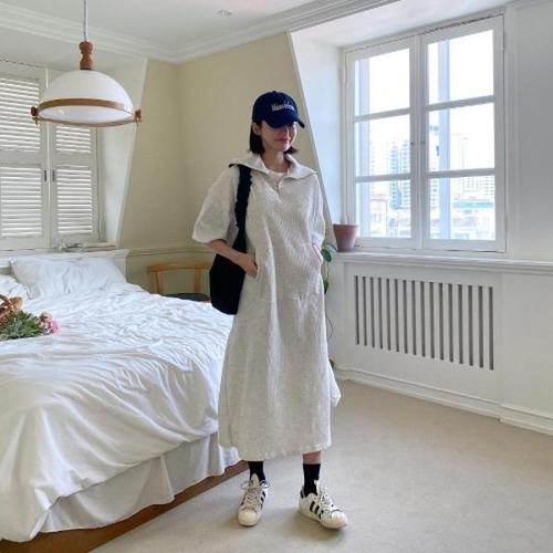 네모엔룩 여성용 피케카라반소매 여름 코튼소재 셔츠카라넥 반오픈 데일리 반소매 미니 원피스 NL