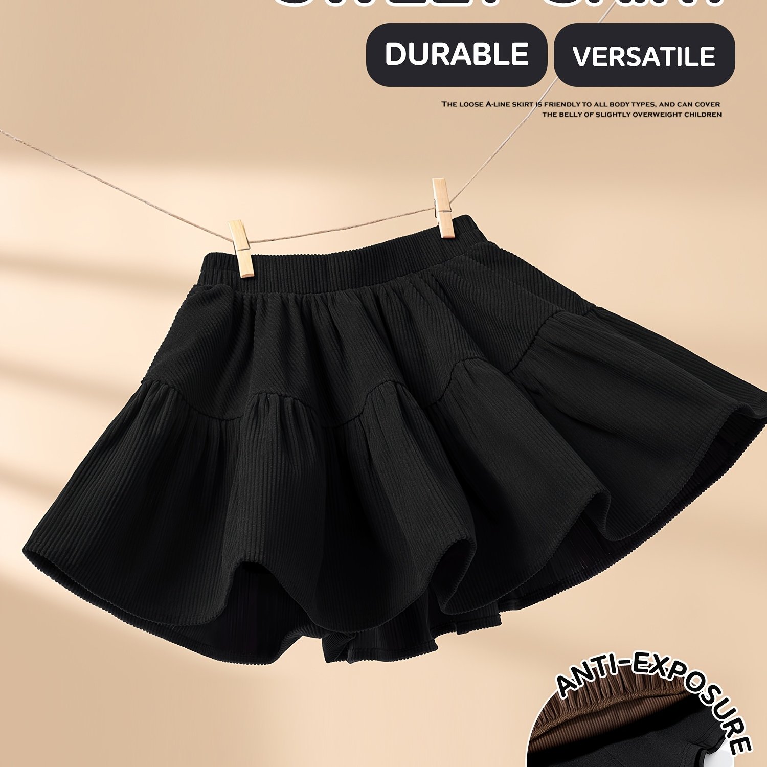 TEMU 여아용 코듀로이 공주 드레스 1개, 빈티지 텍스처, 내구성 및 내마모성, 다리 길이 연장 및 미백 효과, 부드럽고 피부에 친화적, 숏 스커트, 안전 속옷 포함, 허리가 조이지 않음, 블랙, 심플하고 활용도 높음, 선물용으로 적합