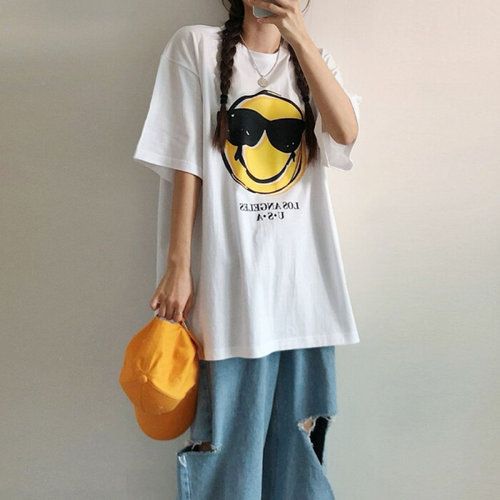 미즈큐즈 / 선글라스 스마일 프린팅 오버핏 박시 커플 반팔 티셔