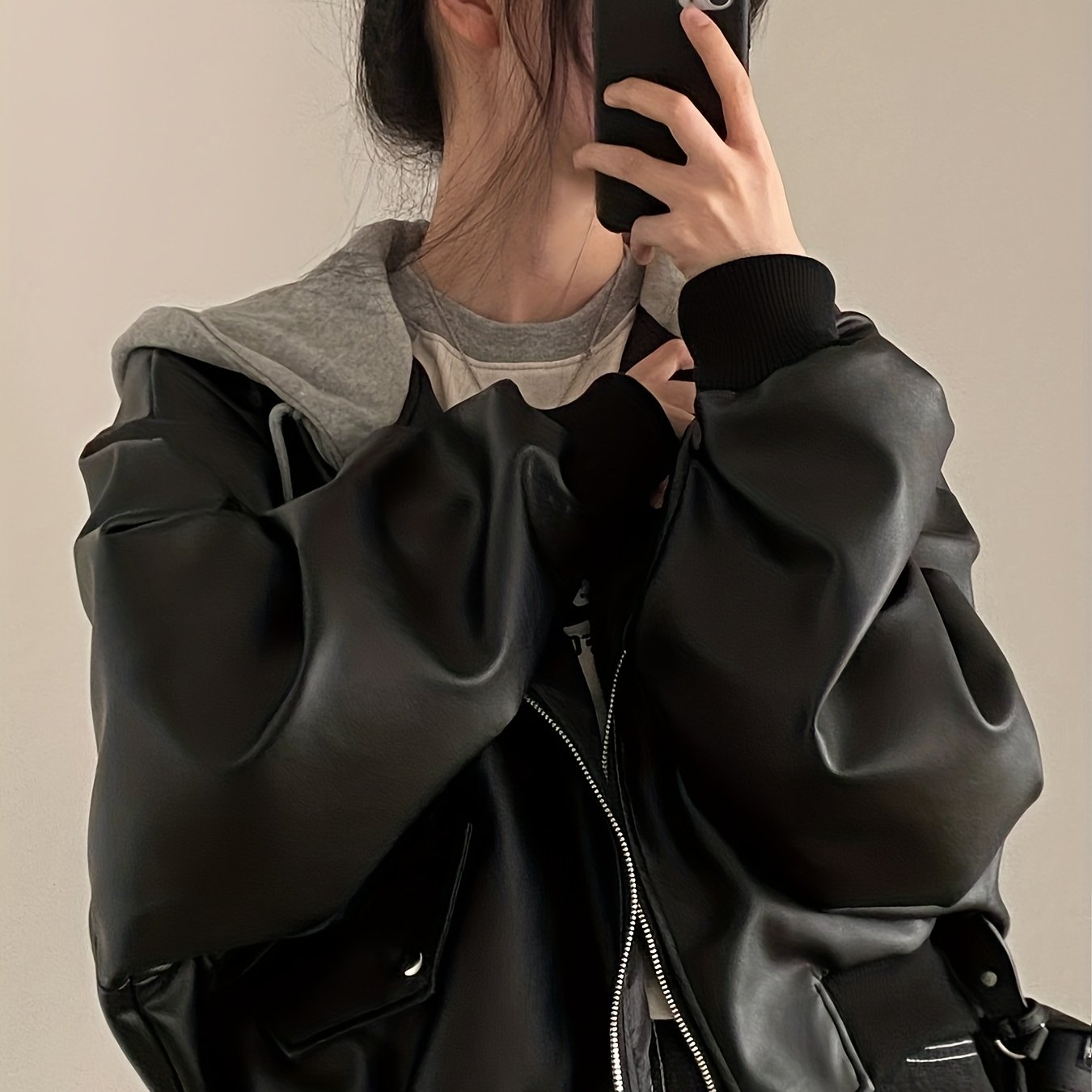 TEMU 컬러블록 빈티지 지퍼 포켓 탑 루즈 배트윙 슬리브 다용도 페이크 투피스 후드 PU 가죽 재킷 여성용