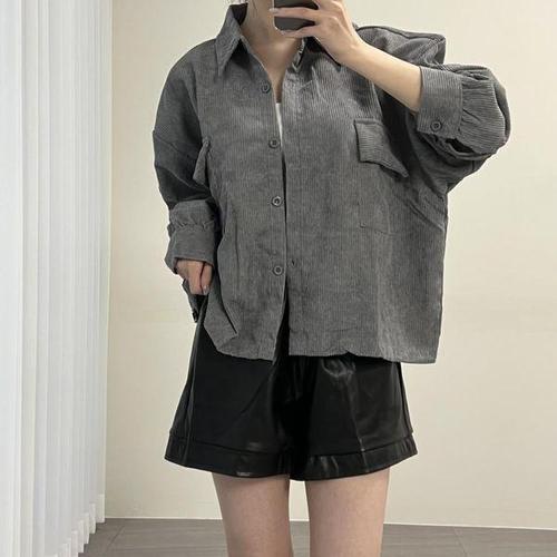 POMTOR 1+1 봄 가을 여성 코듀로이 긴팔 셔츠 루즈핏 캐주얼 긴팔 포켓 남방 상의