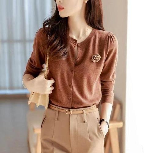 [다잇템]여자 장미 버튼 볼드숄더 골지 코사지 가디건
