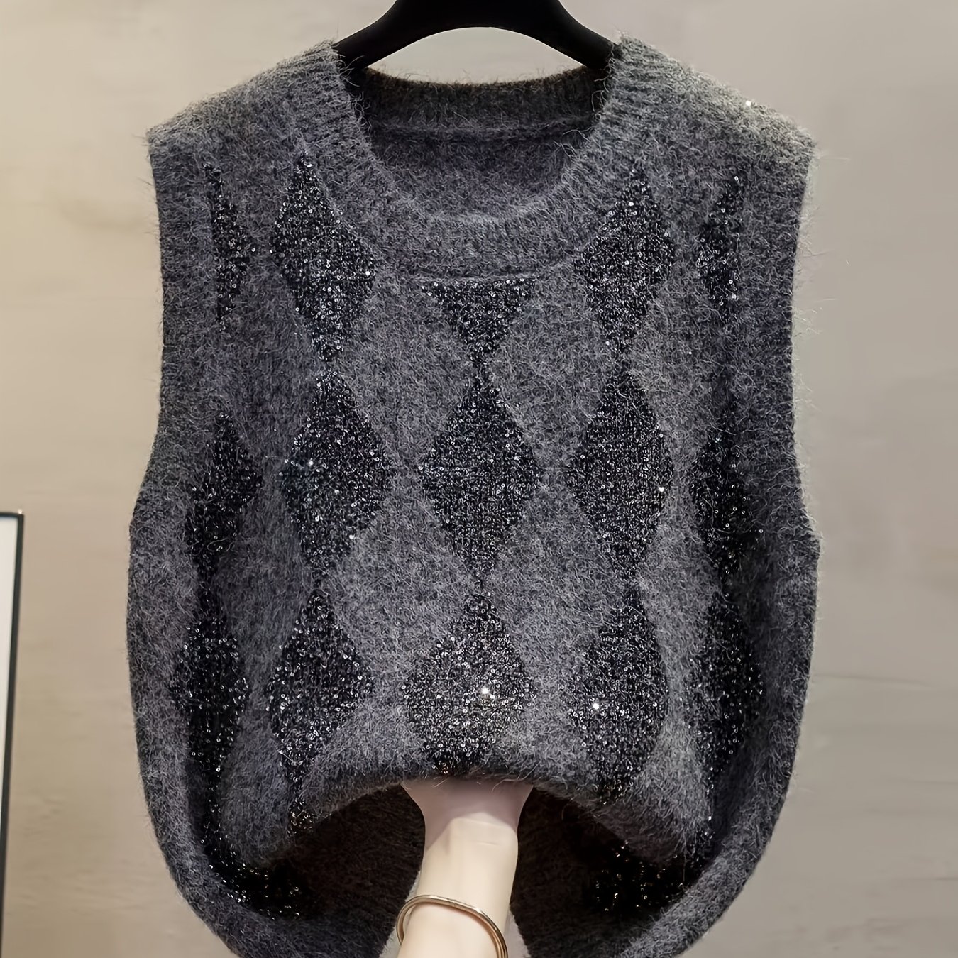 TEMU 우아한 봄/가을 여성용 조끼 | 크루넥, 플라워 자카드 패턴, 스팽글, 민소매, 레귤러 길이