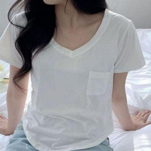 [에이치플러스몰]포켓 베이직 인기 면티 여자 올데이 브이넥 무지 감성