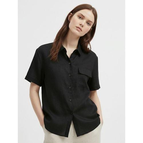 [샵앤]여성 카라넥 쿨링 린넨 반팔 루즈핏 블라우스 셔츠 NARU-WBL-21084-블랙
