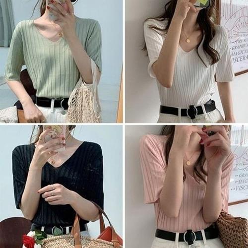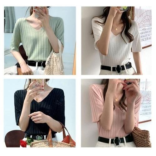 [엄지척]여름반팔티 니트 봄 쿨소재 골지짜임 브이넥_19677634_667501