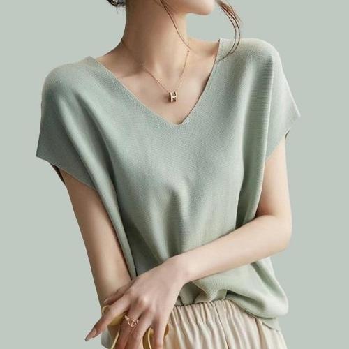 [셀러허브_여성트랜드패션]봄 여름 여자 브이넥 니트 쿨소재 반팔티